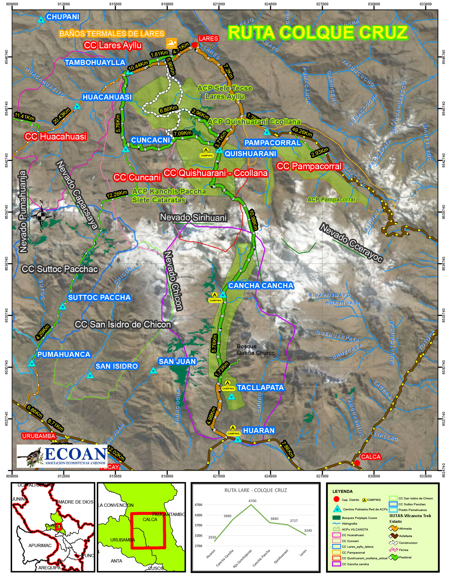 El tours el primer día inicia en el sector de la Aserradora de la Hacienda Huarán, para luego tomar una caminata en ascenso de 3 a 5 horas hacia la comunidad de Cancha Cancha el cual cuenta con área de camping. El segundo día, muy temprano, te preparas para seguir ascendiendo a más altura y pasar por el abra de Pachacútec donde se aprecia el nevado Colque Cruz y un despliegue de lagunas, y de aquí empieza a descender al campamento de Koyalay, las Siete Cataratas y llegar a la Comunidad de Quishuarani, que le espera con un albergue de 20 camas. El tercer día, la caminata continúa por el bosque nativo de queuñas y luego el abra Uchuykasa para llegar a la comunidad de Cuncani. Tras un descanso, vienen los baños termales de Lares como fin de la caminata. Este mismo tours se realiza en forma inversa.